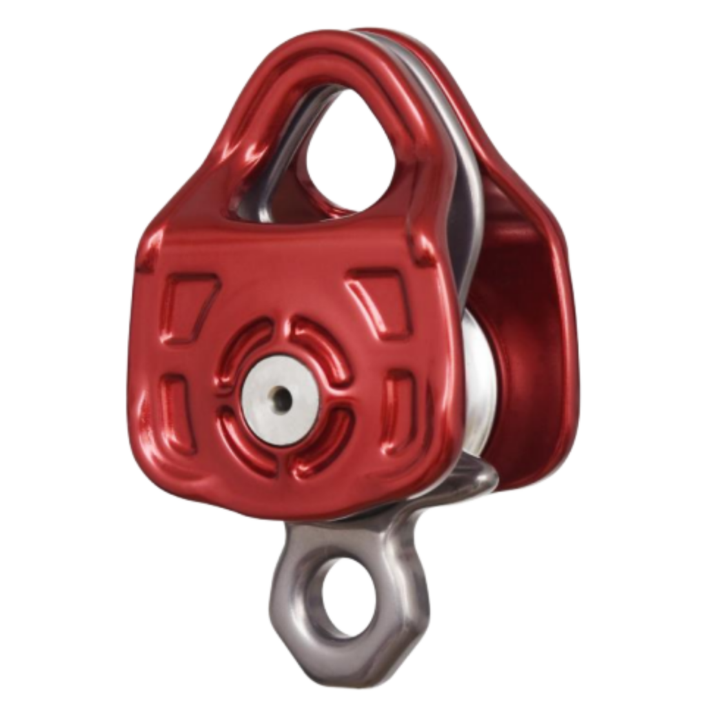 - Double Aluminum anchorage pulley, light weight, movable side/middle plates which allows quick installation and coupling with a rope clamp.