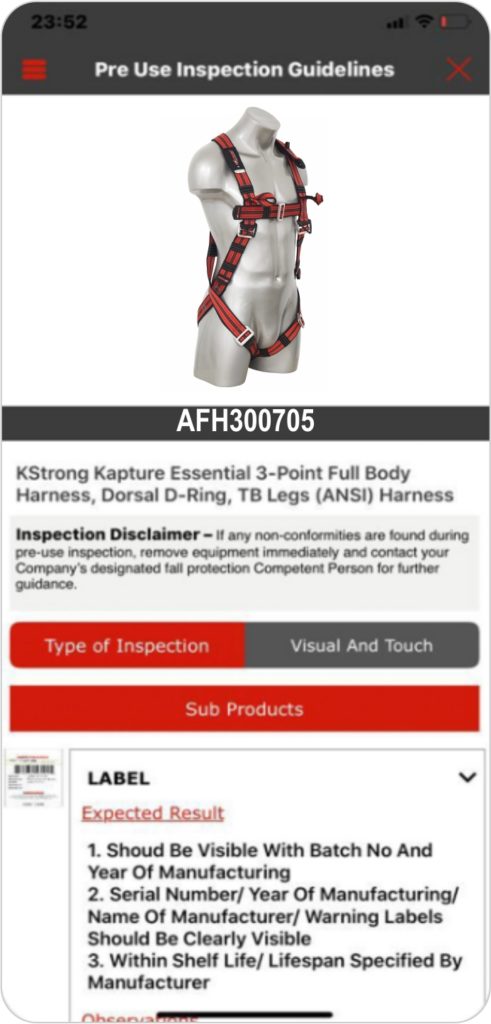 Date of Manufacture – Serial Number – Batch Number – Pre use inspection tips and actions steps – User Manual – Specification Sheet – Declaration of Conformity (DoC) – Date of last Competent Person inspection and future inspection reminder setting options – Product Pics, Videos, PowerPoints, and more